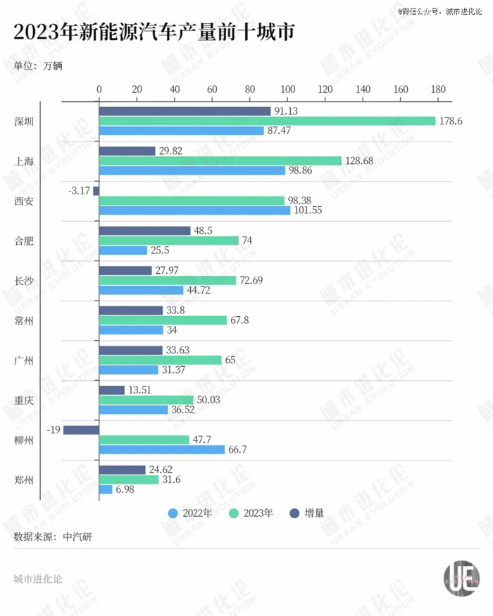 在2022年新能源汽车产量TOP5城市分别为西安、上海、柳州、深圳、重庆,而在2023年已经变成了深圳、上海、西安、合肥、长沙。
