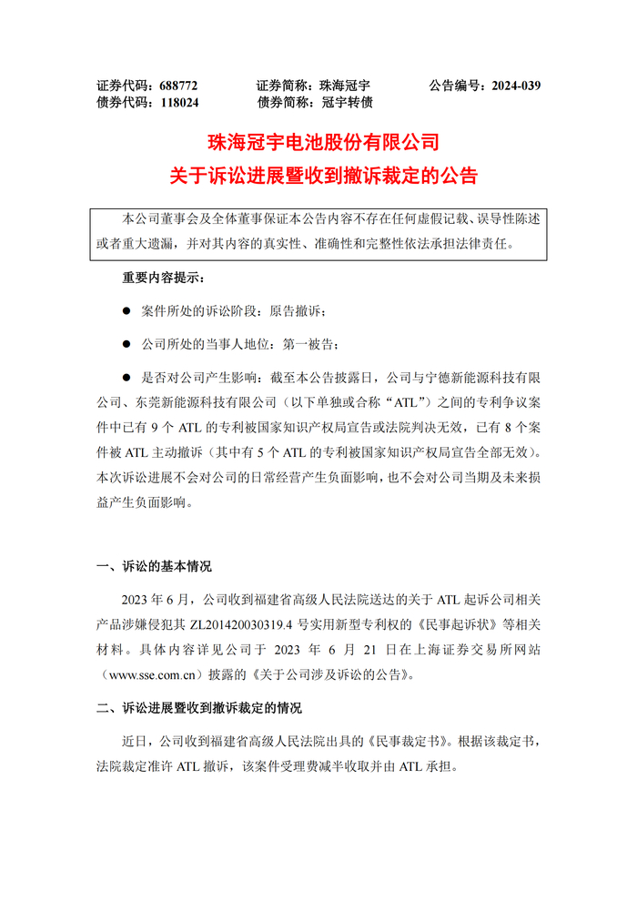 北极星储能网获悉,5月28日,珠海冠宇发布公告称,珠海冠宇电池股份有限公司(以下简称“公司”)、公司全资子公司重庆冠宇电池有限公司(以下简称“重庆冠宇”)于近日收到重庆市第一中级人民法院送达的关于公司及重庆冠宇以专利侵权为由起诉宁德新能源科技有限公司(以下简称“被告一 ATL”)及其他被告的《受理案件通知书》等相关材料。
