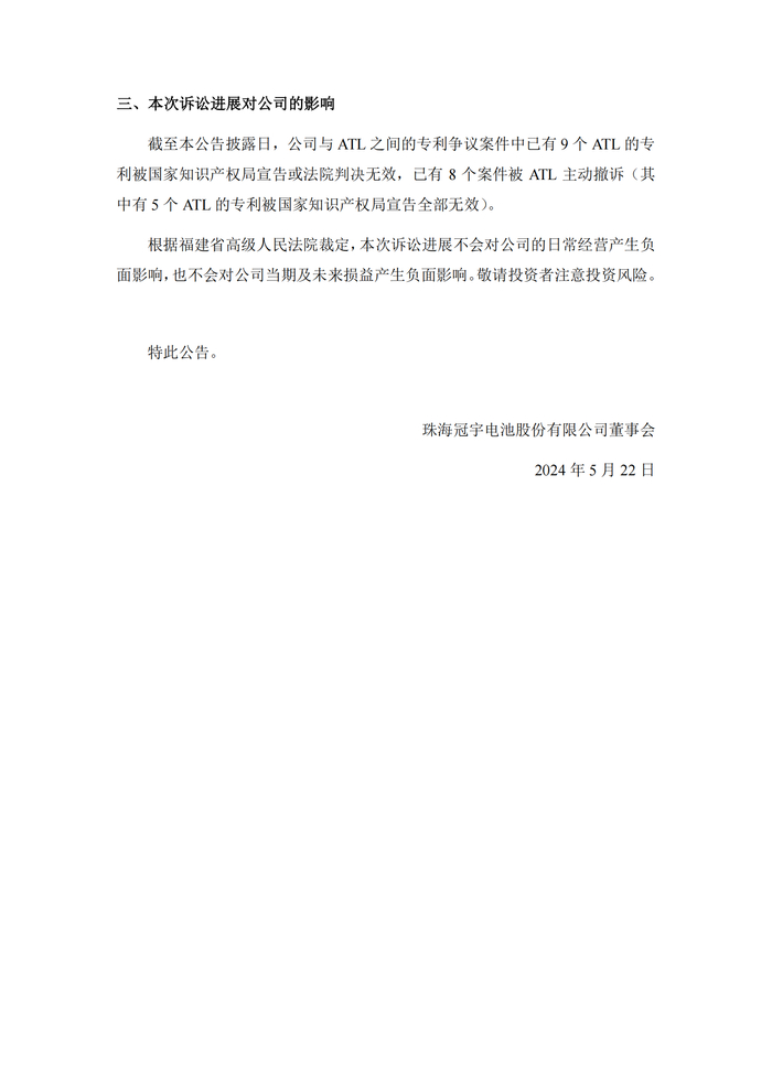 据悉,在珠海冠宇IPO之前,便与ATL有专利纠纷案件。近日,5月21日珠海冠宇发布公告称,截至本公告披露日,公司与宁德新能源科技有限公司、东莞新能源科技有限公司(以下单独或合称“ATL”)之间的专利争议案件中已有9个 ATL 的专利被国家知识产权局宣告或法院判决无效,已有8个案件被 ATL 主动撤诉(其中有5个 ATL 的专利被国家知识产权局宣告全部无效)。