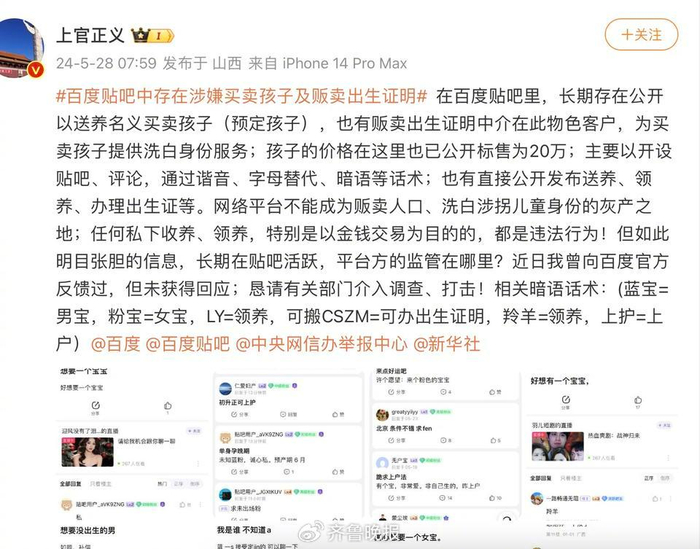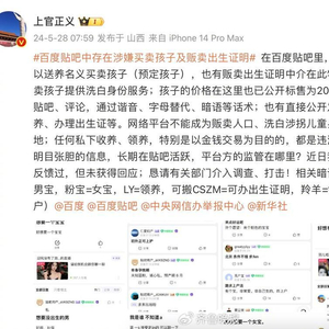 5月28日,继举报小红书平台长期存在“买卖儿童”行为之后,打拐志愿者上官正义再次发文举报有人涉嫌在百度贴吧上买卖孩子及贩卖出生证明。