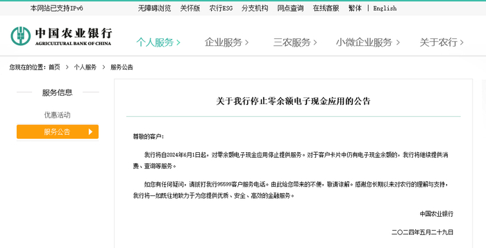 5月29日上午,中国农业银行在官网发文称,将停止零余额电子现金应用。这是继去年建设银行停止银联标准龙卡借记芯片卡电子现金功能后,又一家对电子现金业务进行限制、调整的国有大行。