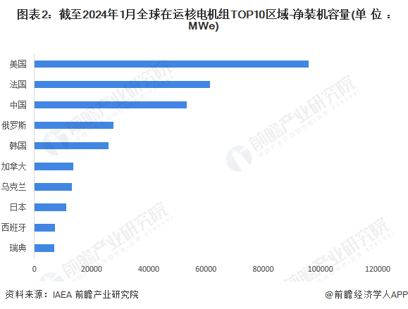 据国际原子能机构(IAEA)统计,截至2024年1月,全球在运核电机组净装机容量达到371510MWe。美国、法国、中国是全球在运核电机组净装机容量最大的3个区域,其中美国在运核电机组装机容量达到95835MWe,位居全球首位。