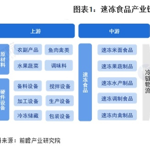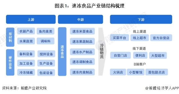 速冻食品产业链上游为原材料及生产过程的硬件设备,其中原材料包括农副产品、鱼肉禽类、水果蔬菜、调味料等,硬件设备包括备料设备、搅拌设备、加工设备、生产设备、冷冻储藏设备及包装设备;仲有速冻食品制造包括速冻米面食品、速冻果蔬制品、速冻水产制品、速冻调制食品及速冻肉制品;下游领域有消费者及B端客户,其中销往消费者的渠道包括线上和线下渠道,B端客户有火锅店、小型餐馆、面包甜点店等。