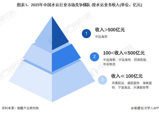 根据水运业务收入的规模划分,中国水运行业可划分为3个竞争梯队。处于行业第一梯队的是中远海控,水运业务收入超500亿元,达到1681.26亿元;处于第二梯队的企业业务收入在100-500亿元之间,包括中远海能、中远海特、招商轮船、中谷物流;处于第三梯队的企业业务收入不超过100亿元,包括凤凰航运、盛航股份、海峡股份、宁波海运、兴通股份等。