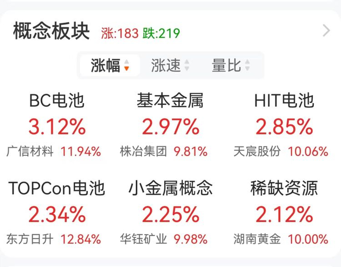 值得关注的是,板块题材上,BC电池、基本金属、HIT电池、固态电池板块涨幅居前。