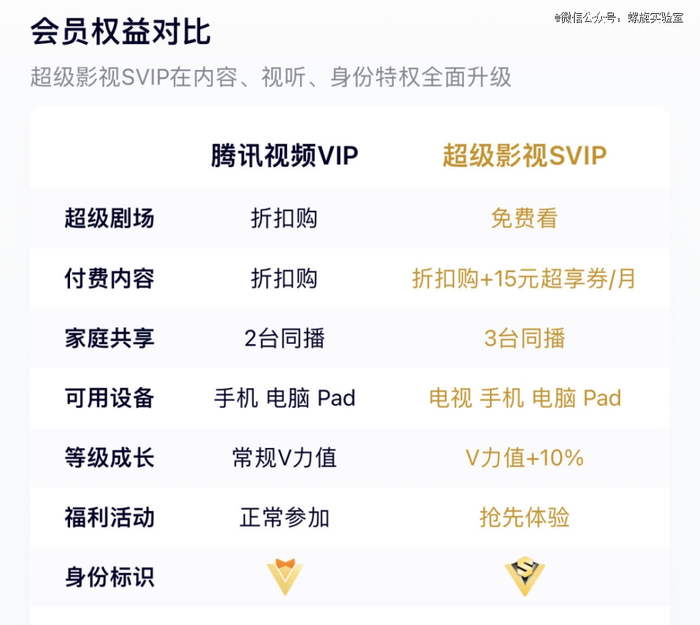 升级后的SVIP,价格相比之前的高阶套餐并没有多少涨幅,但在提供电视端收看的基础上提供了更多权益,尤其是内容特权。如腾讯视频的SVIP,除了能每次更新抢先看,还能免费看幕后*vlog、剧集衍生节目等超级剧场的内容。