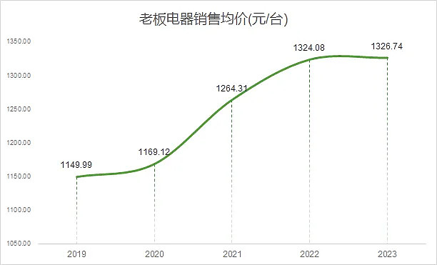从老板电器的销售均价来看,自2019年以来老板电器涨价非常明显,销售均价从2019年的1149.99元/台涨到2023年的1326.74元/台,累计涨价幅度超15%,特别是2021年、2022年这两年涨价特别快。