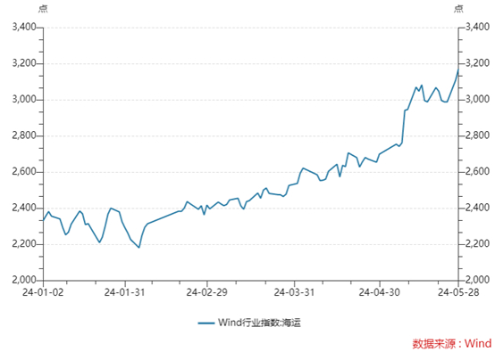 WIind海运指数显示,进入二季度以来指数跳涨,由3月底的2526.23点涨至5月28日的3171.63点。