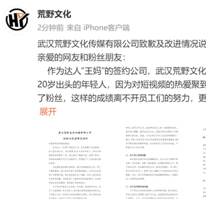 28日,网红“王妈”所在公司武汉荒野文化传媒有限公司发表声明,对近日网友曝出的“招聘软件开出的待遇是大小周、自备电脑,还有人称工资4000左右、有加班情况、最近两年公司参保人数是0人”等问题进行澄清说明,并对其中的一些管理问题向员工道歉。