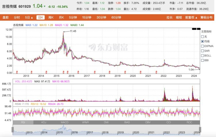 盘面上,吉视传媒股票已经连续两日跌停,截至29日收盘报1.04元/股,总市值36.29亿元。创下公司自2012年上市以来的最低股价。