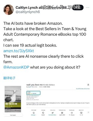 根据独立作家凯特林·林奇(Caitlyn Lynch)2023年6月的统计,彼时亚马逊上“青少年浪漫”的类型下,畅销排行榜的前100本电子书中,有约八成都是语无伦次的,看起来很像是AI生成的。