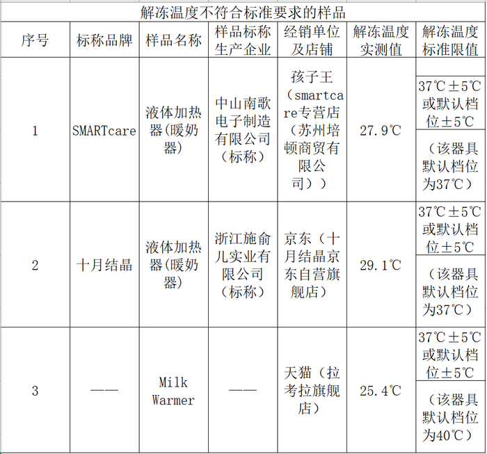 在解冻温度项目中,有3批次样品不符合:器具在解冻功能下,进入设定的恒温模式后进入待机模式过程中,实时奶温与设定奶温的偏差超过±5℃的范围。如果婴儿饮用此类器具解冻的奶液,由于温度较低,容易引起腹泻等健康问题。