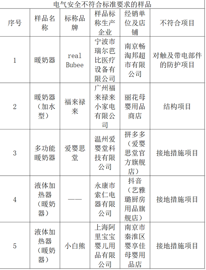 儿童节即将到来,5月29日,江苏省消保委发布《暖奶器产品比较试验分析报告》。此次采样涉及抖音、拼多多、网易严选、京东、苏宁易购、天猫、孩子王、得物8个电商平台和6家实体店。36批次样品中,检出问题的共9批次,占比25%。不符合相关标准的问题主要分为两个方面:电气安全、使用性能。