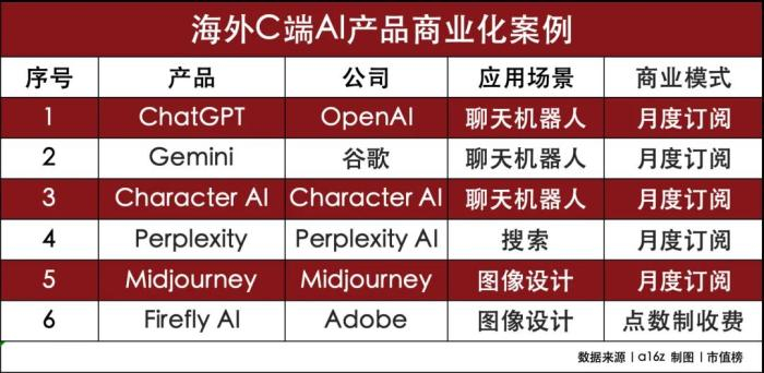 今年3月,美国风险投资机构a16z发布的报告显示,排名前三的都是AI聊天机器人,ChatGPT仍是C端应用顶流,机构预计今年ChatGPT的收入是10亿美元。