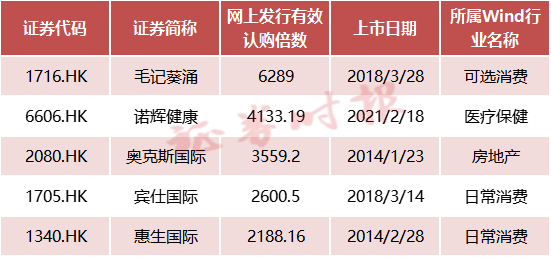 证券时报记者统计数据发现,港交所新股公开发售网上有效认购倍数超过1000倍的有45只新股,超过2000倍的有8只新股,超额认购倍数最高的为毛记葵涌,高达6289倍。优博控股超2200倍的超额认购倍数可以超越惠生国际排在香港史上第五位。