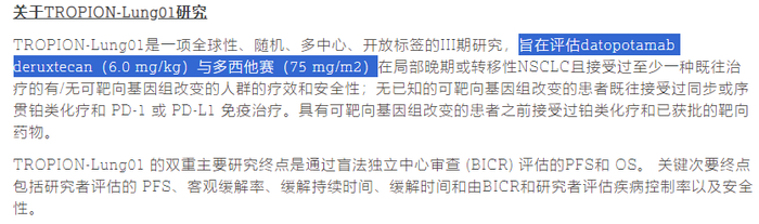 而TROPION-Lung01是一项全球性、随机、多中心、开放标签的III期研究,旨在评估datopotamab deruxtecan与多西他赛在局部晚期或转移性NSCLC且接受过至少一种既往治疗的有/无可靶向基因组改变的人群的疗效和安全性;无已知的可靶向基因组改变的患者既往接受过同步或序贯铂类化疗和PD-1或PD-L1免疫治疗。具有可靶向基因组改变的患者之前接受过铂类化疗和已获批的靶向药物。