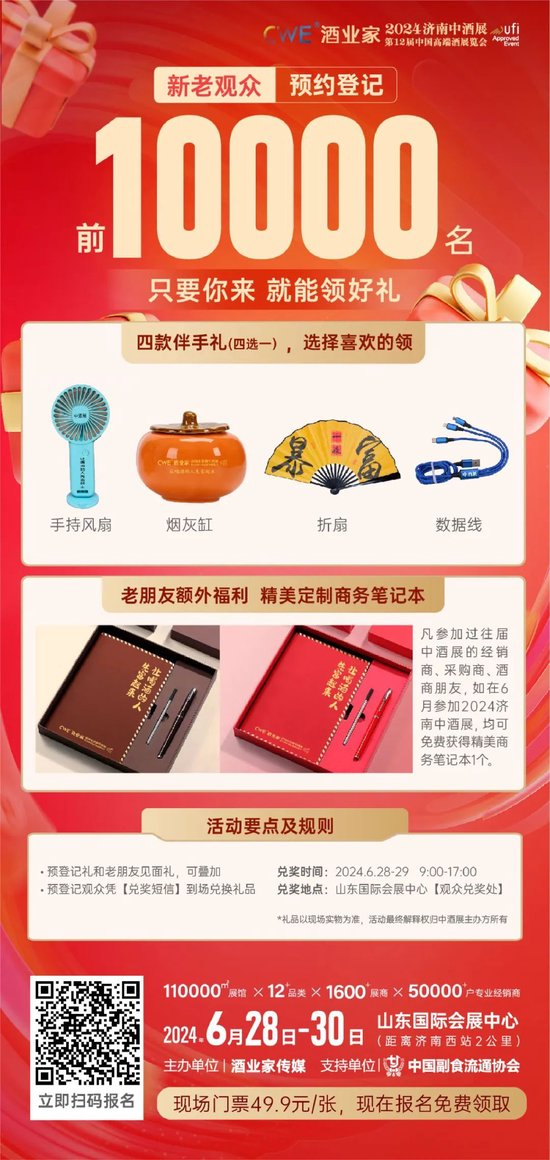 让喝酒的人先富起来,酒业家2024济南中酒展,从展览布局到展品展示,从内容策划到体验升级,精心筹备、力求极致。6月28日-30日,一场年度行业盛会,期待您的参与!即刻参与预登记报名,锁定多重好礼,锁定好运气和好机遇!