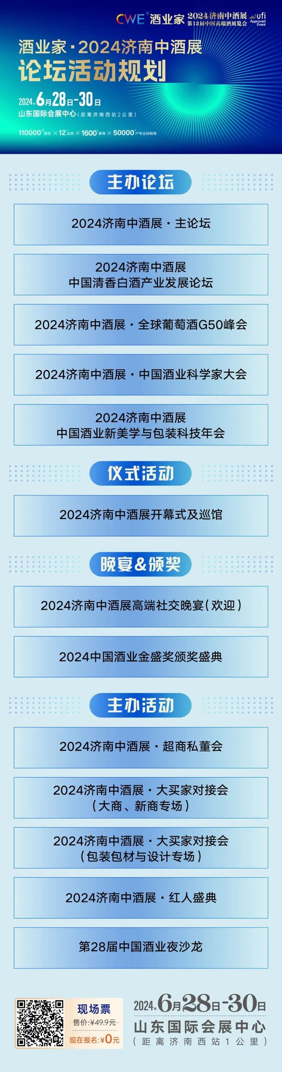 目前,本届展会的论坛活动规划已经出炉,其中5场主办论坛涵盖全行业分析、清香品类发展、葡萄酒复苏、科技创新及酒业包装新美学等领域,其中2024济南中酒展·中国酒业科学家大会,将重点聚焦酒行业科技创新,值得关注。