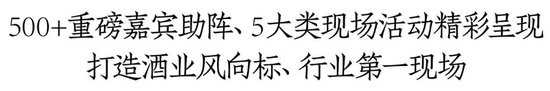 本届中酒展将邀请重量级经济学家、酒业科技人才、行业咨询专家、酒业领军人物、酒业头部营销设计达人、渠道先锋、酒业新营销人才、头部电商平台、跨界专家等超500位重磅嘉宾出席论坛活动,为酒业人带来最新经济视角、行业观点和营销思路、实操策略。