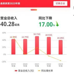 根据曲美家居近期披露的2023年年报和2024年一季报,2023年公司营业总收入40.28亿元,同比下降17.00%;净亏损3.04亿元,同比下降923.06%。