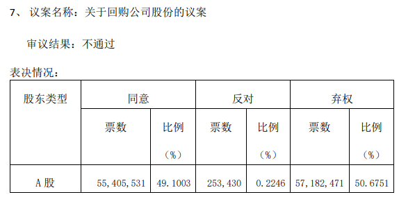 - 仅有回购公司股份方案这一小股东提出的议案未获审核通过,结果显示:49.1%投票同意、0.2246%投票反对、50.6751%投票弃权,其中98.525%的持股5%以下股东投票同意。