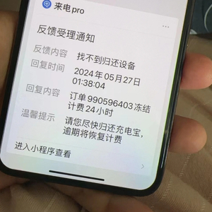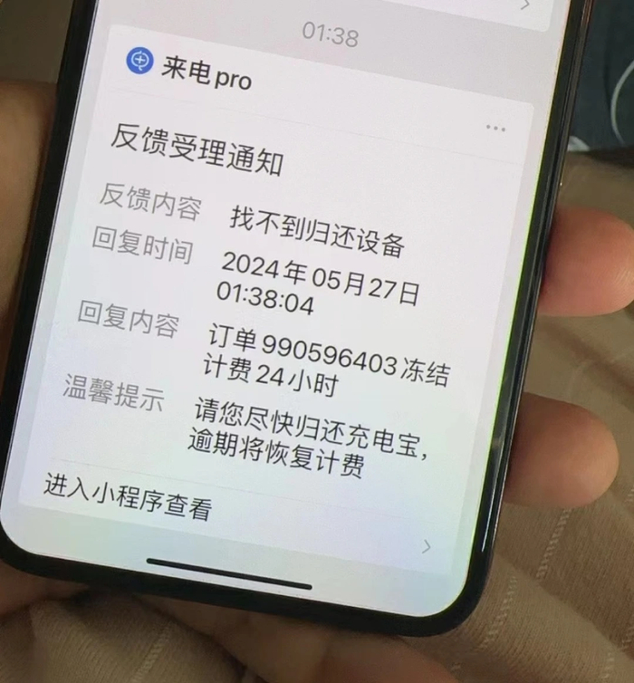 “妈妈很惦记,一直在追问充电宝有没有归还。我们找了两天,实在是没有办法了。”侯先生称,为了归还这个充电宝,他骑着电动车至少跑了5个多小时。“因为找不到归还设备,我们申请了停止计费,显示24小时后会恢复计费。这段时间我们继续找,还是找不到,不是虚假站点,就是机器塞满了,会让我们质疑,来电公司就是为了扣199元的押金。我们这才摔了充电宝发泄一下。”