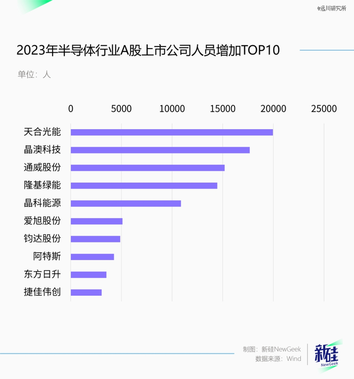 半导体行业这边,人员变动比较平均,没出现比亚迪这样的极端情况。天合光能(19954)、晶澳科技(17667)、通威股份(15192)三家公司流入员工数量TOP3。