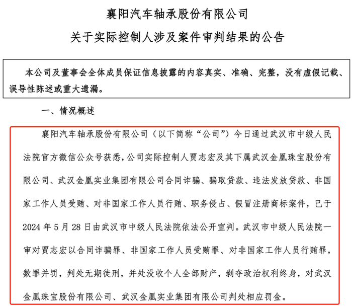 5月28日晚间,A股上市公司襄阳轴承突然公告称,武汉市中级人民法院一审对公司实际控制人贾志宏以合同诈骗罪、非国家工作人员受贿罪、对非国家工作人员行贿罪,数罪并罚,判处无期徒刑,并处没收个人全部财产,剥夺政治权利终身,对武汉金凰珠宝股份有限公司、武汉金凰实业集团有限公司判处相应罚金。
