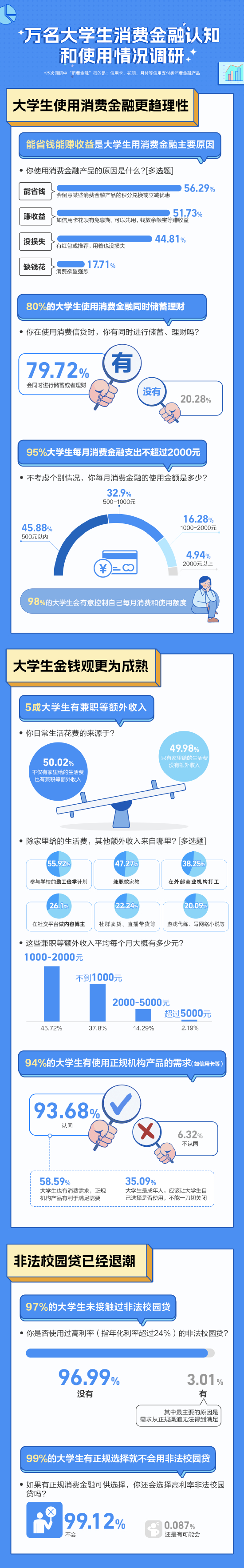 2024年5月,新浪财经对超过1万名大学生开展了《2024大学生消费金融认知和使用情况调研》。调研显示,大学生使用消费金融更趋理性,八成大学生使用消费金融的同时有自己的储蓄和理财。98%的大学生会有意控制自己每个月的消费和使用额度。