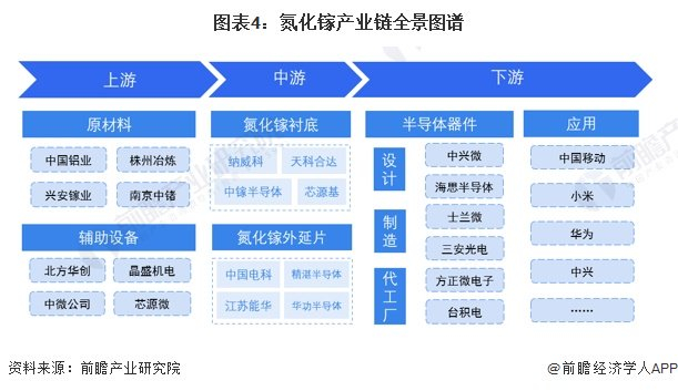 尽管碳化硅被更多地作为衬底材料(相较于氮化镓),国内仍有从事氮化镓单晶生长的企业,主要有纳威科、天科合达、中镓半导体、芯源基等;从事氮化镓外延片的国内厂商主要有中国电科、精湛半导体、江苏能华、华功半导体等;从事氮化镓器件制造的厂商主要有中兴微、海思半导体、士兰微、三安光电等。