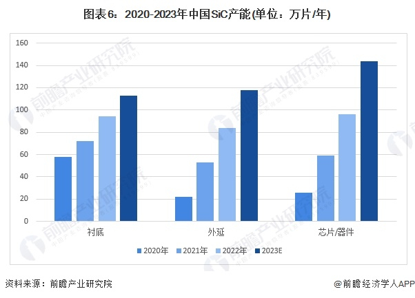 在电动汽车等应用拉动下,国内SiC产能高速增长。2022年,SiC衬底产能达到94万片/年(折合6英寸),相较于2021年增加30.6%;外延产能达到84万片/年(折合6英寸),相较于2021年增加58.5%;芯片/器件产能达到96万片/年,相较于2021年增加62.7%。结合部分企业2023年年报情况,初步统计2023年SiC衬底、外延和芯片/器件产能分别为113万片/年、118万片/年和144万片/年。