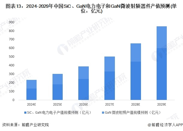 近五年,第三代半导体材料电力电子市场复合增长率约40%,GaN微波射频市场复合增长率约48%。由于近年来下游需求市场的飞速增长,加上新一代信息技术的应用升级,中国第三代半导体材料拥有广阔的市场前景。电力电子市场在新能源汽车、光伏、数据中心、快充等需求带动下将持续保持较高增速,微波射频市场将伴随5G宏基站建设而稳步增长。预计到2029年,中国SiC、GaN电力电子器件应用市场规模有望突破600亿元,年复合增长率为35%;GaN射频器应用市场规模或将突破250亿元,年复合增长率为20%;中国第三代半导体材料整体市场规模或达到855亿元,年均复合增长率约30%。