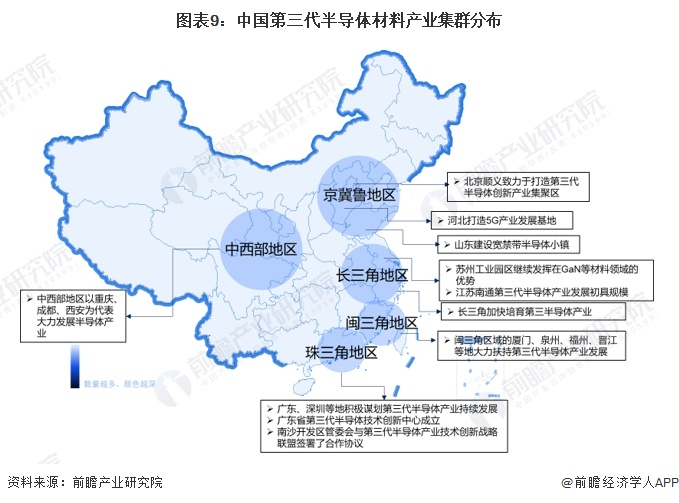 当前,我国第三代半导体材料初步形成了京津冀鲁、长三角、珠三角、闽三角、中西部等五大重点发展区域,各个集群有其各自的特点。