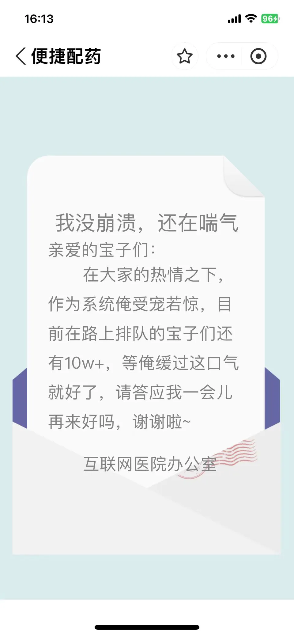 互联网医院页面显示:目前路上排队的宝子们还有10w+,等俺缓过这口气就好了,请答应我一会儿再来好吗,谢谢啦。