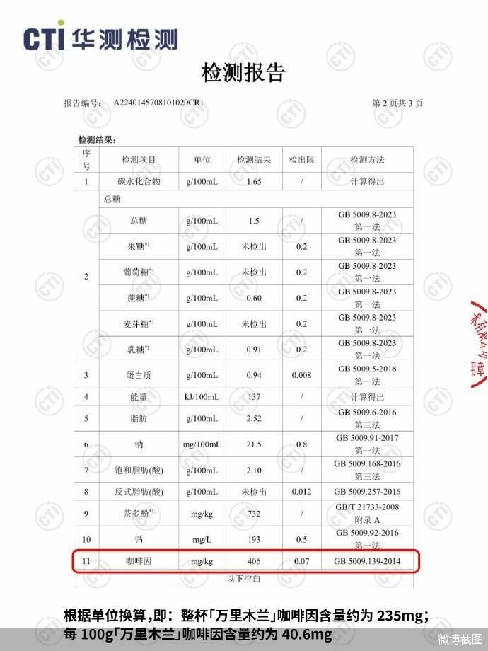 北京商报讯(记者 张天元)5月30日,霸王茶姬针对社交平台上引发热议的“喝完‘万里木兰’失眠”一事做出回应。霸王茶姬表示,根据国家权威检测机构华测检测出具的“万里木兰”产品成分检测报告,一杯“万里木兰”的咖啡因含量相当于一杯“拿铁咖啡”的咖啡因含量。