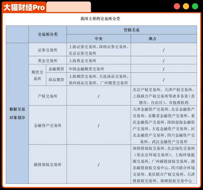 现在我们有六大类交易所:证券交易所、黄金交易所、期货交易所、产权交易所、金融资产交易所和碳排放交易所。
