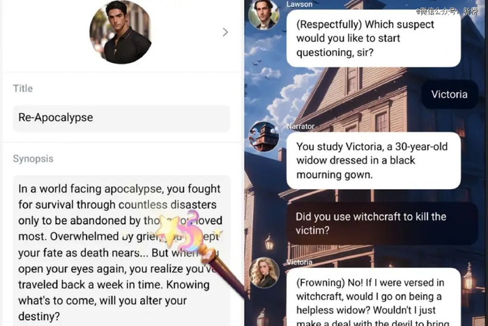 玩法和“猫箱”相似,用户可以通过AI身份图、角色介绍和故事概要,选择跟不同的AI角色进行互动,并解锁不同的剧情。