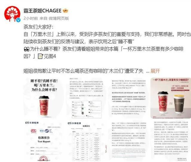 霸王茶姬表示,一杯「万里木兰」的咖啡因含量与一杯同等规格的「拿铁咖啡」相当。因此,一些平时较少饮用咖啡或习惯喝淡茶的消费者在品尝「万里木兰」后可能会感觉较为兴奋,从而影响睡眠。