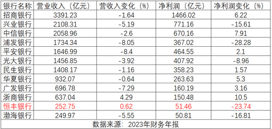 将恒丰银行的营收与净利情况放在12家股份制银行对比来看。从营收端,恒丰银行的营收体量排在倒数第二位,仅高于渤海银行,但也是12家股份银行中唯二营收同比增长的银行。