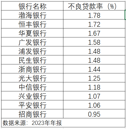 2023年恒丰银行的不良贷款率为1.72%,比2022年下降了9个基点,连续20个季度下降,从自身来看表现较好。而如果将恒丰银行的不良贷款率放在12家股份制银行中,相对并不占优势。