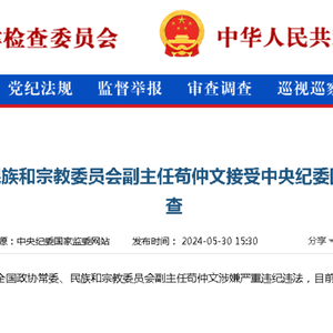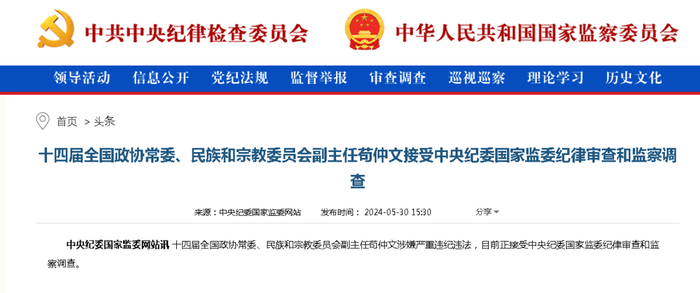 5月30日,中央纪委国家监委网站发布消息,十四届全国政协常委、民族和宗教委员会副主任苟仲文涉嫌严重违纪违法,目前正接受中央纪委国家监委纪律审查和监察调查。