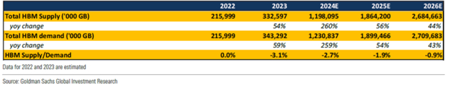 高盛对 2024 年、2025 年和 2026 年的最新预测显示,HBM 供应缺口分别为 2.7%、1.9% 和 0.9%。这表明,与他们之前的预测(供应短缺分别为 2.0%、1.0% 和 0.7%)相比,供需缺口更为紧张。