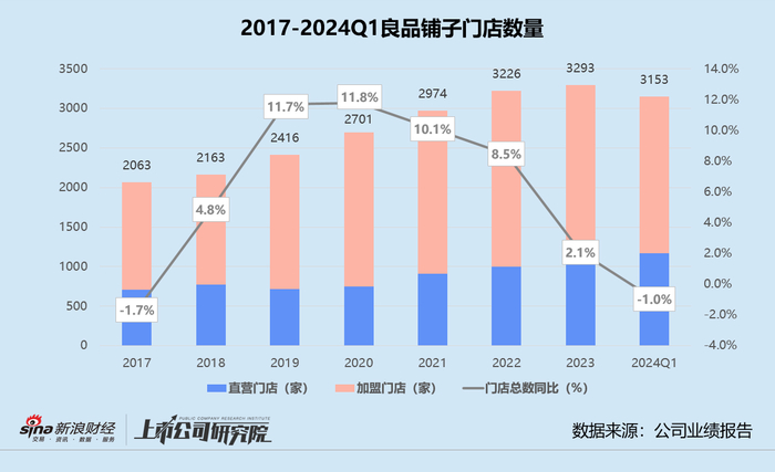 截至2023年12月31日,良品铺子共有3293家门店,其中加盟店占比61.9%,较2022年末净减少191家。2024年1-3月,加盟门店数量继续下降,关闭的195家门店中有103家为加盟店,对总门店数量贡献比例由2023年第一季度的67.8%降至62.8%。