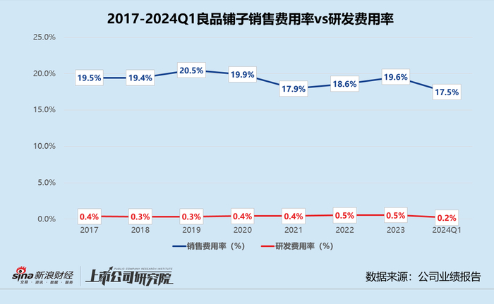 结合往期数据来看,良品铺子研发费用率长期不足0.5%,近5年的销售费用却平均都在15亿元左右,占当期总营收比例保持在20%上下。2024年第一季度,公司研发费用仅为495.58万元,同比大幅减少61.7%,占比总营收降至0.2%。而同期销售费用高达4.28亿元,约为研发费用的85.60倍。