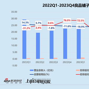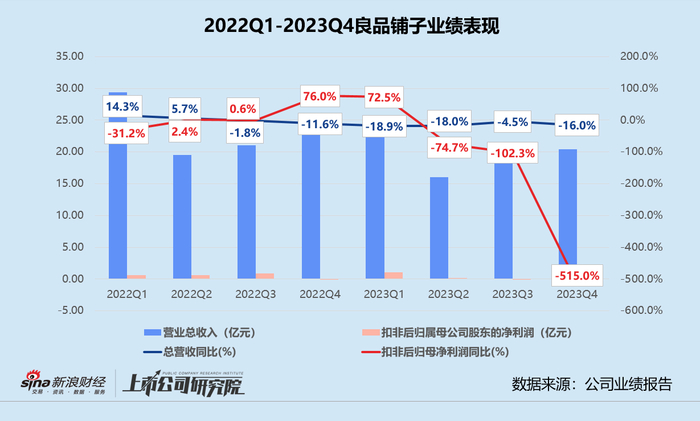 事实上,从2022年第三季度开始,良品铺子就一直在走下坡路。营收连续6个季度滑坡,销售毛利率持续走低至25.4%,而2018年第三季度至2021年第二季度平均毛利率约为31.7%。2023年第四季度,公司更是由盈转亏,扣非后归母净亏损约5650.06万元,销售净利率跌为负数。