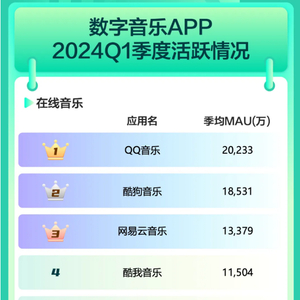 极光大数据显示,2024年Q1国内前五大数字音乐类APP月活跃用户合计约6.47亿,这一数字占到国内10.74亿网络音频用户的60%。
