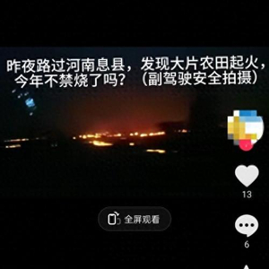 大皖新闻记者注意到,在某短视频平台上,有多位网民发视频称,5月29日晚,正阳县农田起火,视频中可见农田有多处火点。一位视频发布者告诉记者,视频确实是当晚实拍,且白天也有焚烧的情况发生。其中,还有位网民提到,大火发生在正阳县境内的永兴乡,并配文“烧麦草大开放啦!”。