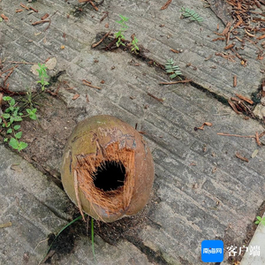 掉落在地上的一个个椰果出现拳头大的洞口,壳内的椰汁椰肉已不见踪影。
