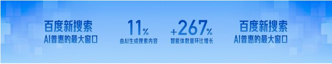 5月30日,在“百度万象大会”上,智能体(Agent)被作为重点项目呈现。百度集团资深副总裁、百度移动生态事业群组总经理何俊杰讲道:“目前,百度搜索有 11%的搜索结果是由 AI 生成的。从上个月的create大会到现在,智能体数量环比增长了 267%。 ”
