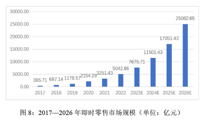 根据商务部国际贸易经济合作研究院发布的《即时零售行业发展报告(2023)》,近年来,即时零售一直保持50%以上的年均增速,2022年市场规模达到5042.86亿元。预计2025年,即时零售市场规模将达到2022年的三倍。